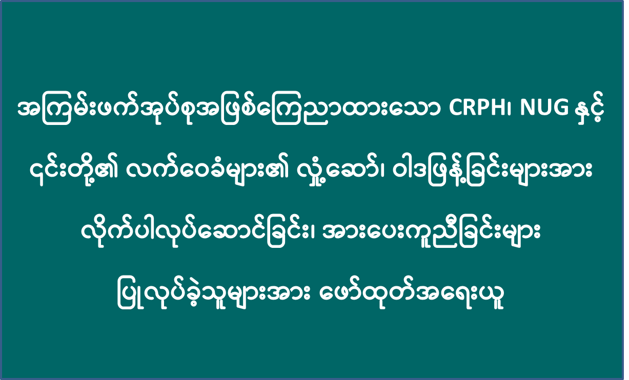 ထိုကဲ့သို့ CRPH၊ NUG နှင့် ယင်းတို့၏ လက်အောက်ခံအဖွဲ့အစည်းများ၊ ယင်းတို့နှင့် ဆက်နွှယ်နေသော အဖွဲ့အစည်းများ၊ လူပုဂ္ဂိုလ်များသည် နိုင်ငံတော်တည်ငြိမ်အေးချမ်းရေးကို ပျက်ပြားစေရန်နှင့် အစိုးရယန္တရားများ ပျက်ပြားစေရန် ရည်ရွယ်လျက် လှုံ့ဆော်ခြင်း၊ ဝါဒဖြန့်ခြင်းများ ပြုလုပ်ခဲ့မှုအပေါ် အားပေးကူညီခြင်းပြုလုပ်ခဲ့သူများအား ဥပဒေနှင့်အညီ ထိရောက်စွာ အရေးယူ သွားမည်ဖြစ်ကြောင်းနှင့် ထိုသို့လှုံ့ဆော်သူ၊ ဝါဒဖြန့်သူများအား ဆက်လက်ဖော်ထုတ်အရေးယူသွား မည်ဖြစ်ကြောင်း မိဘပြည်သူများ သိရှိနိုင်ရေးအသိပေးသတင်းထုတ်ပြန်အပ်ပါသည်။