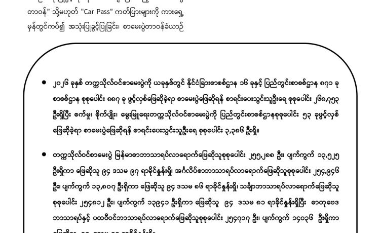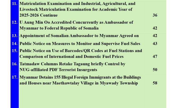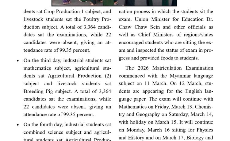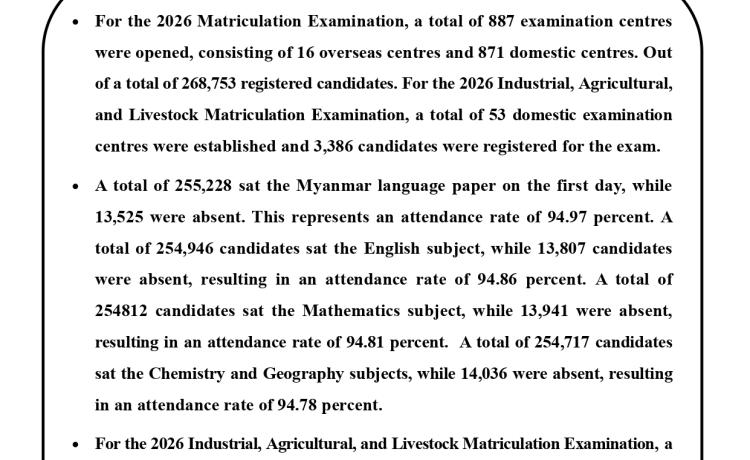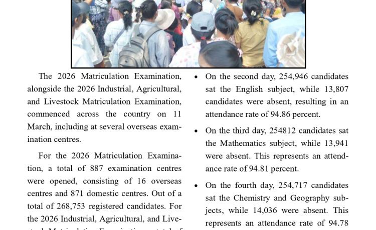 ၂၀၂၆ ခုနှစ်၊ တက္ကသိုလ်ဝင်စာမေးပွဲနှင့် ၂၀၂၆ခုနှစ်၊ စက်မှု၊ စိုက်ပျိုး၊ မွေးမြူရေးတက္ကသိုလ်ဝင် စာမေးပွဲ ပဉ္စမနေ့ ဆက်လက်ဖြ...