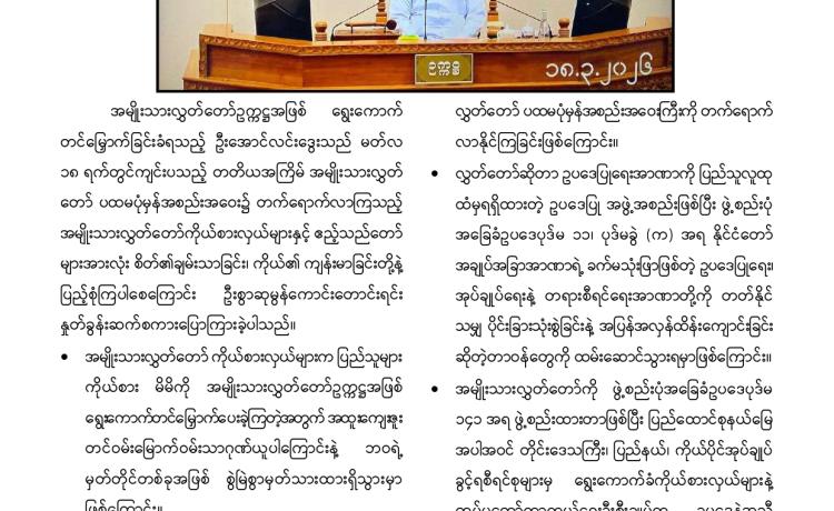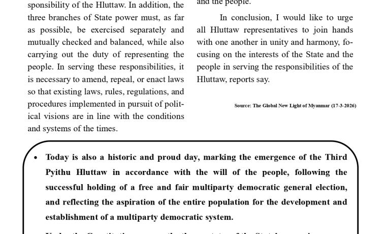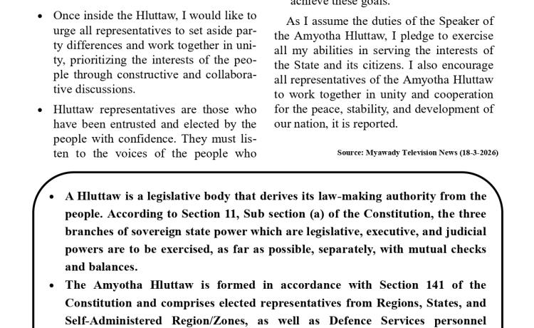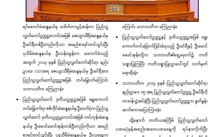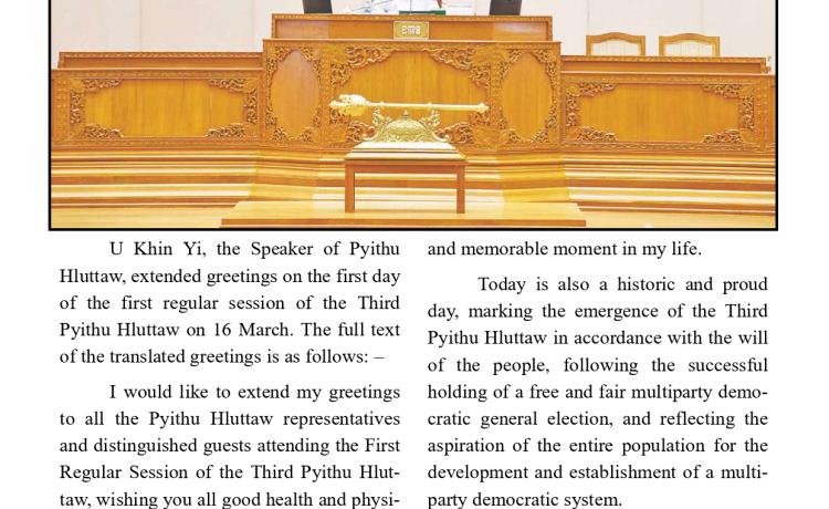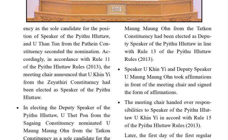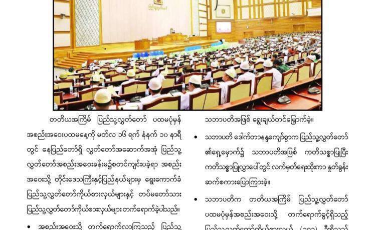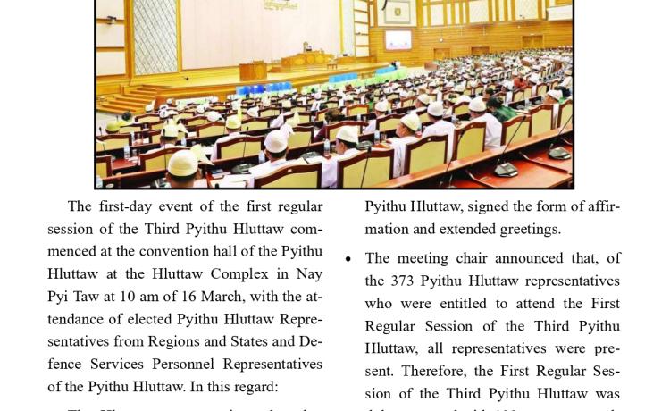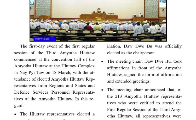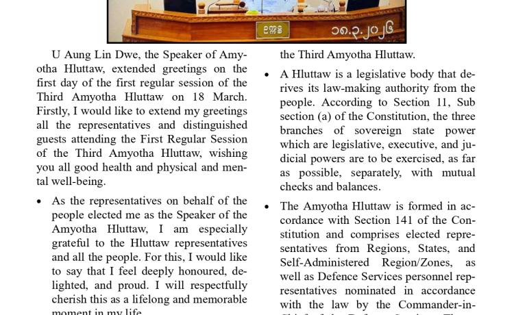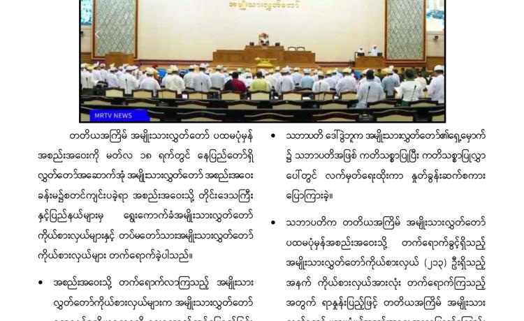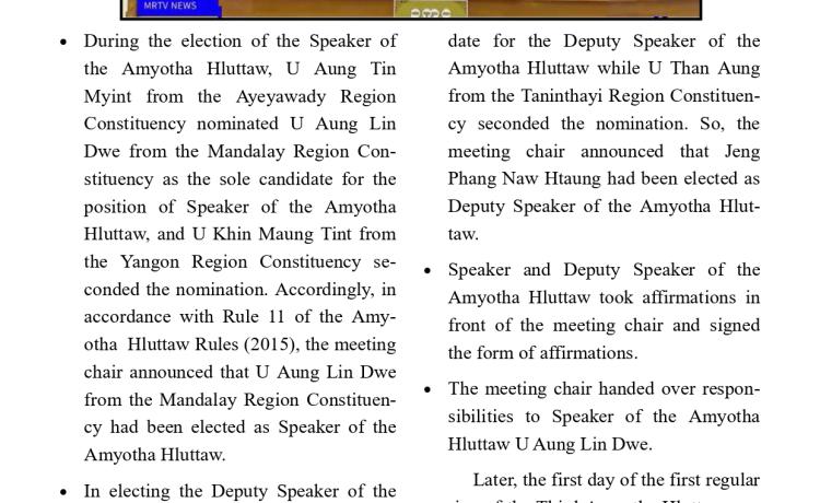 တတိယအကြိမ် အမျိုးသားလွှတ်တော် ပထမပုံမှန်အစည်းအဝေး စတင်ကျင်းပ အမျိုးသားလွှတ်တော်ဥက္ကဋ္ဌအဖြစ် မန္တလေးတိုင်းဒေသကြီး မဲဆန္ဒန...