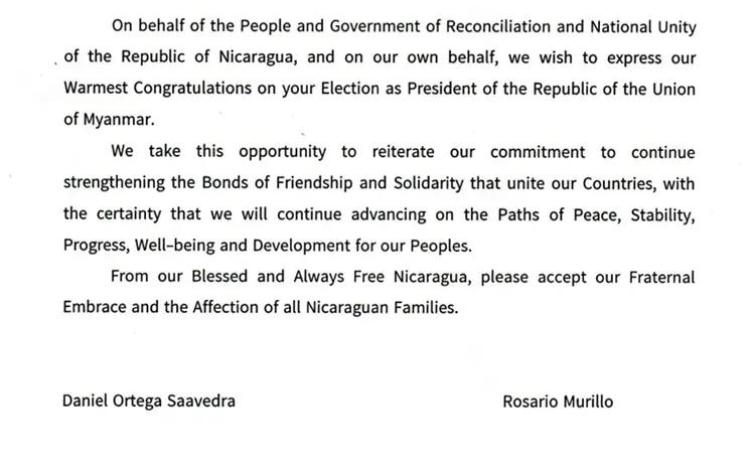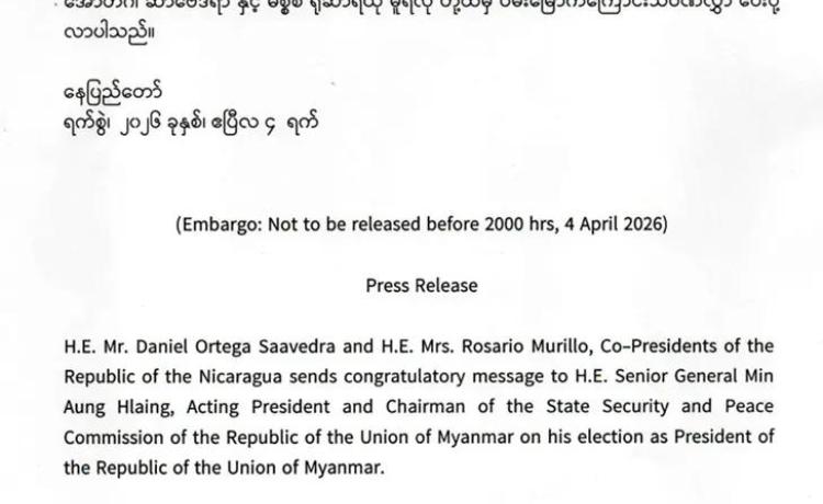 နီကာရာဂွွါသမ္မတနိုင်ငံမှ ဝမ်းမြောက်ကြောင်း သဝဏ်လွှာပေးပို့ အေပြီ ၄