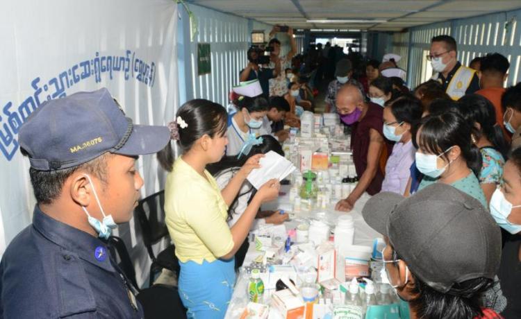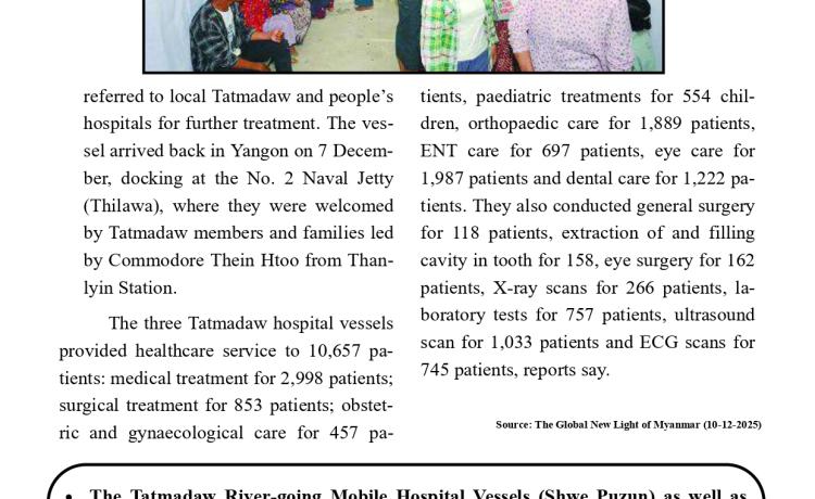 တပ်မတော်မြစ်တွင်းသွားဆေးရုံရေယာဉ်(ရွှေပုဇွန်)နှင့် မြစ်ရေယာဉ်(စကု)မှ တပ်မတော်နယ်လှည့်အထူးကုဆေးအဖွဲ့ ဖျာပုံမြို့နယ်သို့ ရ...