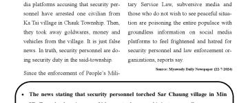 ချောက်မြို့နယ်၊ ကတိုင်ကျေးရွာမှ ပြည်သူ ၁ ဦးကို လုံခြုံရေးတပ်ဖွဲ့ဝင်များက ဖမ်းဆီး