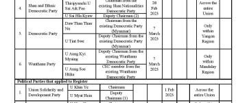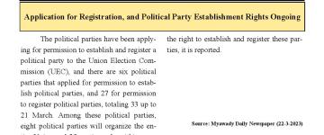 နိုင်ငံရေးပါတီတည်ထောင်ခွင့်နှင့် မှတ်ပုံတင်ခွင့်များ လာရောက်လျှောက်ထားလျက်ရှိ န