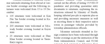 ပြည်ပနိုင်ငံများမှ ပြန်လည်ဝင်ရောက်လာသည့် မြန်မာနိုင်ငံသားများအားနယ်စပ်ဂိတ် အသီးသ